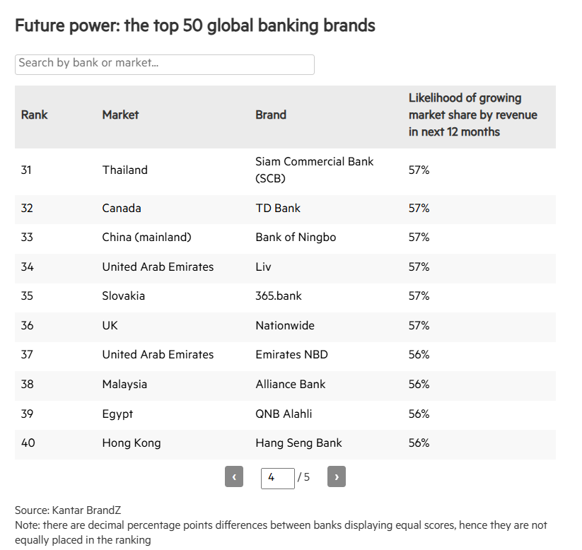 該榜單由凱度(Kantar)和英國(guó)銀行家雜志聯(lián)合發(fā)布,根據(jù)客戶感知來(lái)評(píng)判銀行在未來(lái)12個(gè)月內(nèi)的品牌價(jià)值增速,是否獲得了與其規(guī)模相符的良好品牌資產(chǎn)得分,即該銀行是否正在有效地打造其品牌。